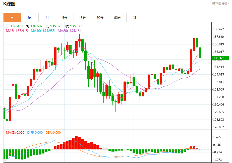 周三盘中,美元/日元报135.428,跌幅0.80%。