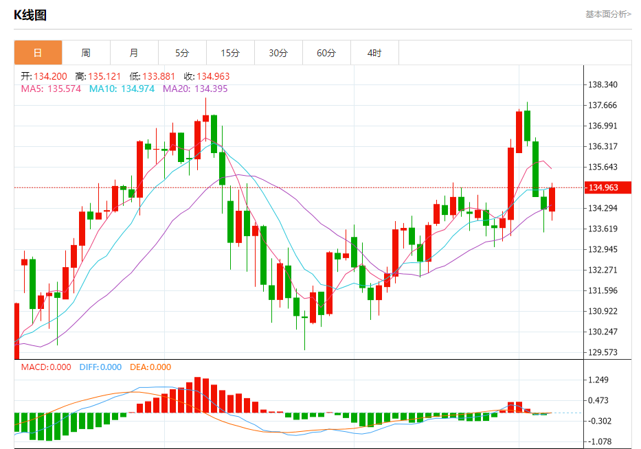 周五盘中,美元/日元报134.957,涨幅0.50%。