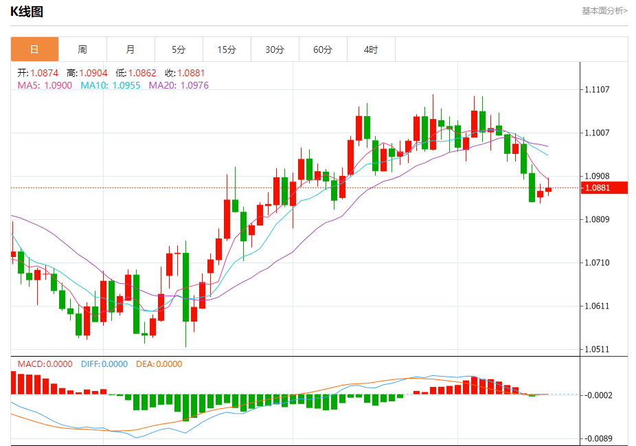 周二盘中,欧元/美元报1.0882,涨幅0.07%。