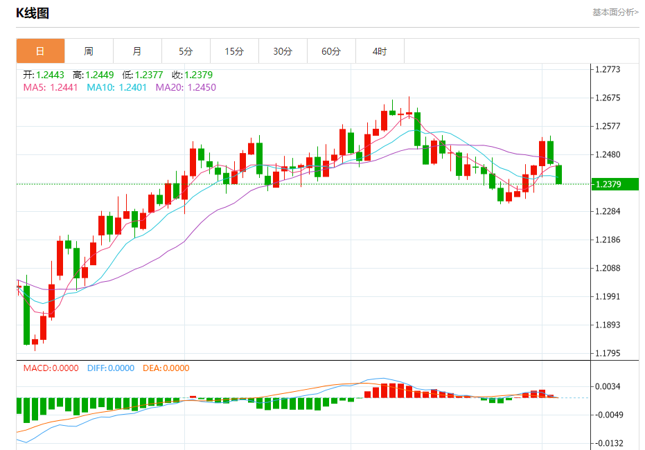 周一盘中,英镑/美元报1.2380,跌幅0.56%。