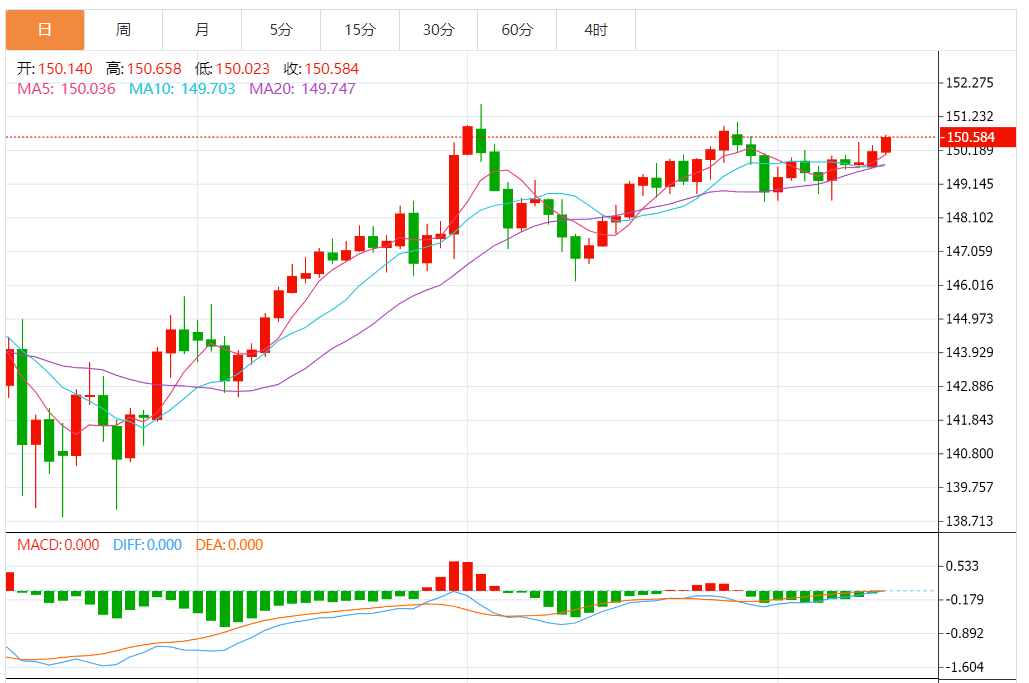 周二,欧元/日元上涨0.29%至150.614附近。