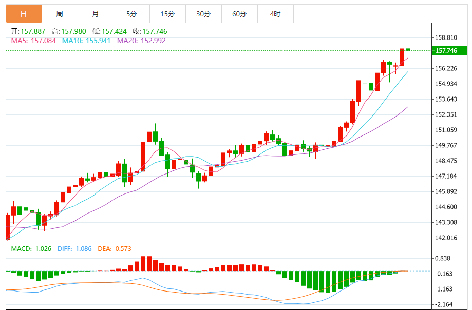 周三,欧元/日元下跌0.08%至157.789附近。