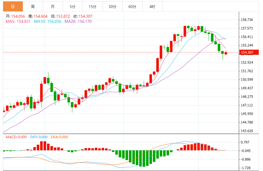 今天的预期交易范围:在154.75和153.20之间