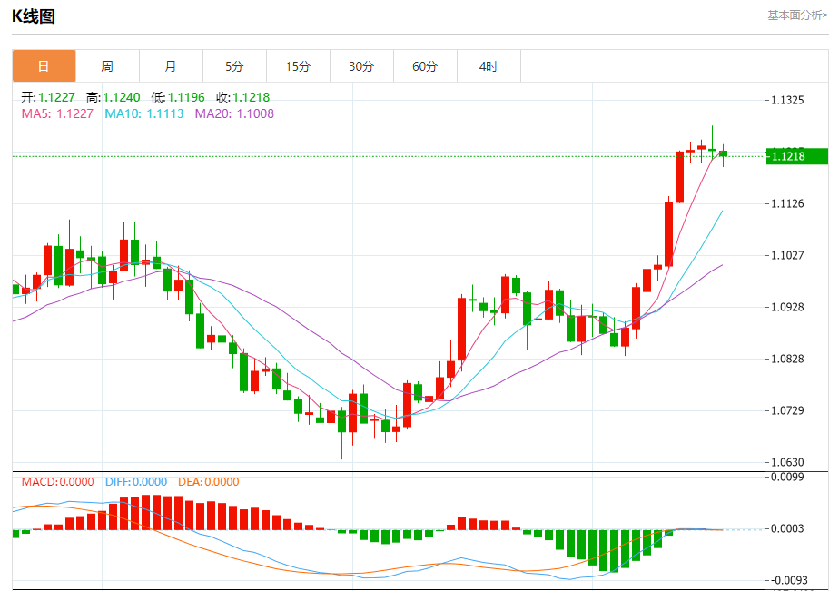 周三盘中,欧元/美元报1.1219,跌幅0.09%。