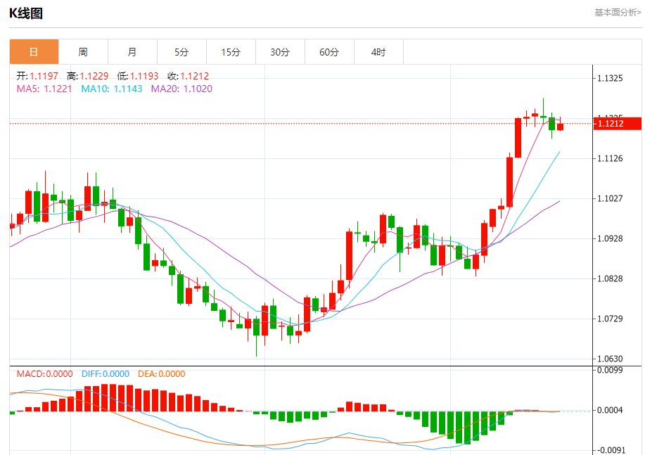 周四盘中,欧元/美元报1.1213,涨幅0.13%。