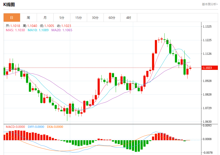 周一盘中,欧元/美元报1.1024,涨幅0.06%。