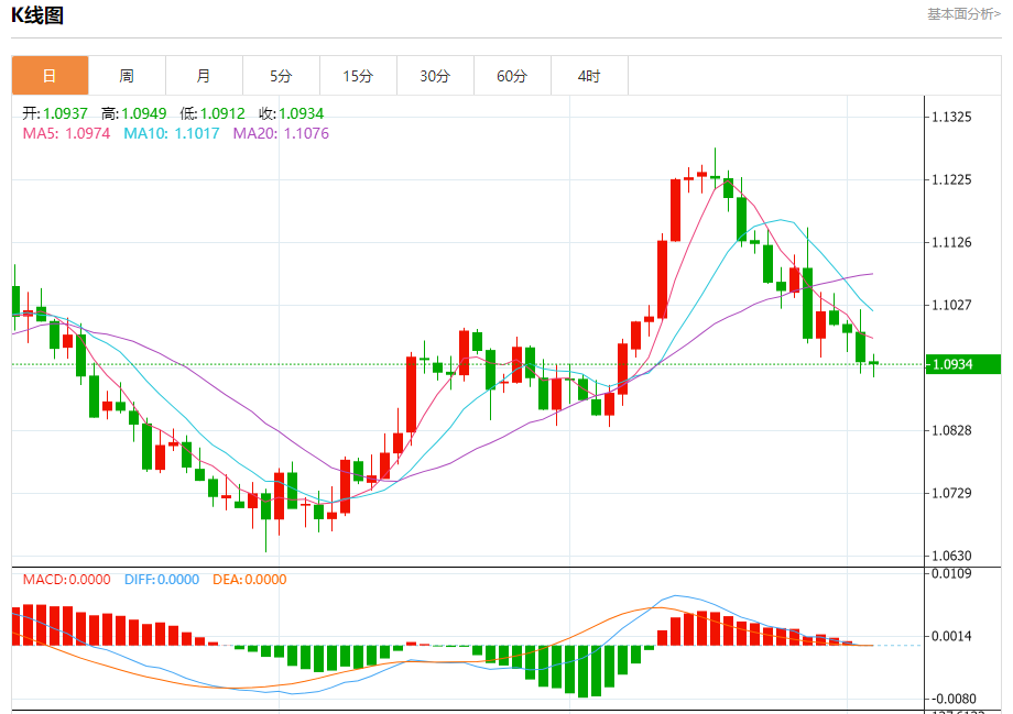 周四盘中,欧元/美元报1.0935,跌幅0.03%。
