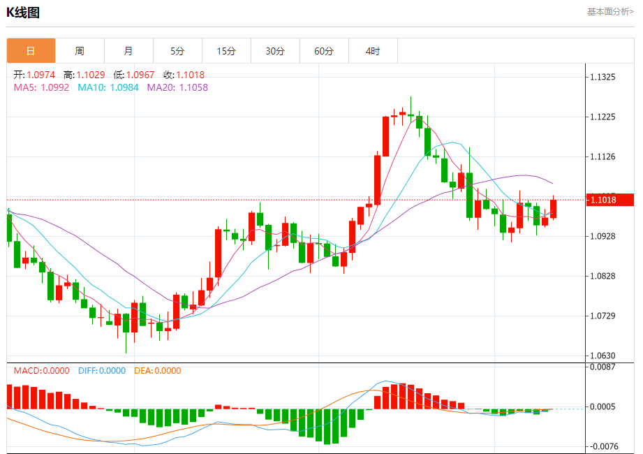 周四盘中,欧元/美元报1.1019,涨幅0.40%。
