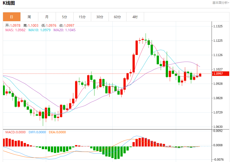 周五盘中,欧元/美元报1.0997,涨幅0.15%。