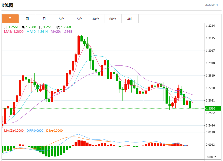 周三盘中,英镑/美元报1.2562,跌幅0.02%。