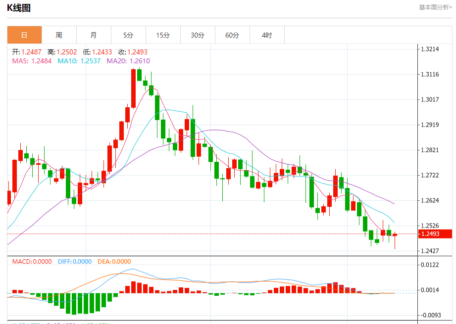 周三盘中,英镑/美元报1.2491,涨幅0.02%。