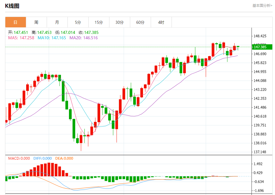 周四盘中,美元/日元报147.400,跌幅0.04%。