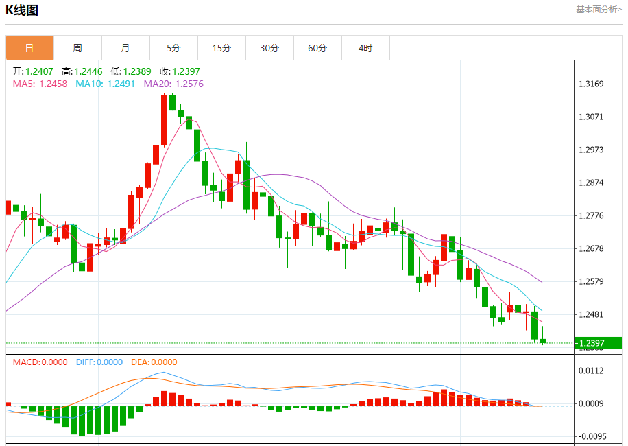 周五盘中,英镑/美元报1.2399,跌幅0.08%。
