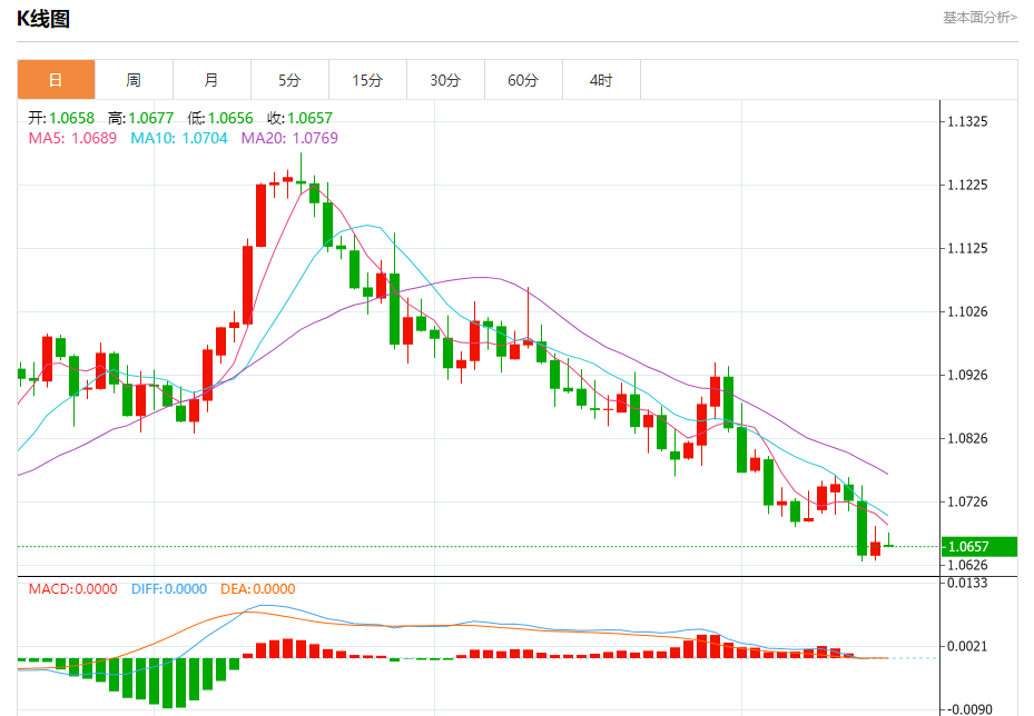 周一盘中,欧元/美元报1.0657,跌幅0.05%。