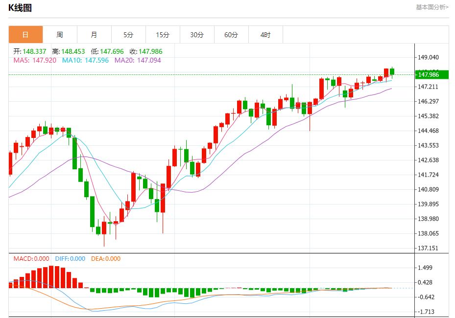 周四盘中,美元/日元报147.989,跌幅0.24%。