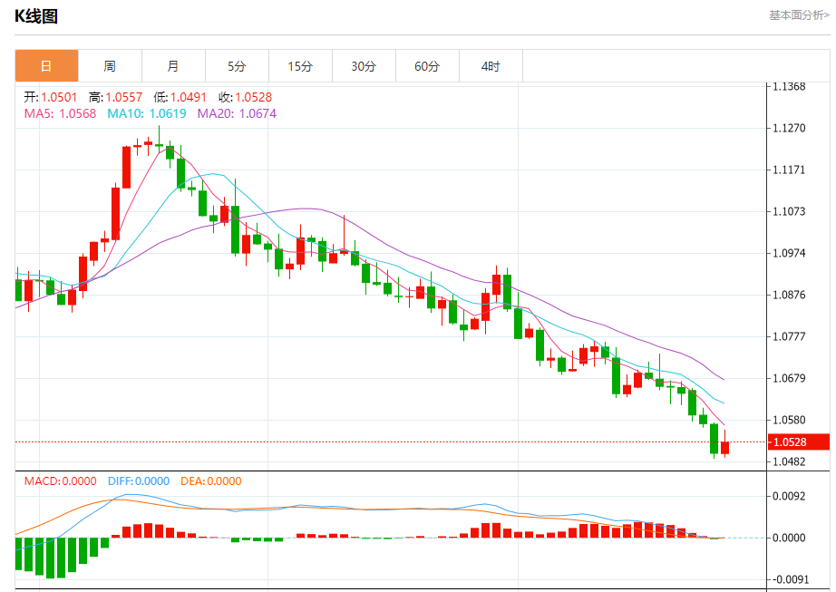 周四盘中,欧元/美元报1.0528,涨幅0.23%。