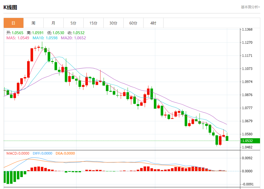 周一盘中,欧元/美元报1.0532,跌幅0.39%。