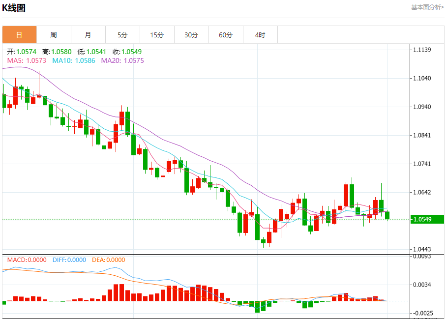 周三盘中,欧元/美元报1.0551,跌幅0.22%。