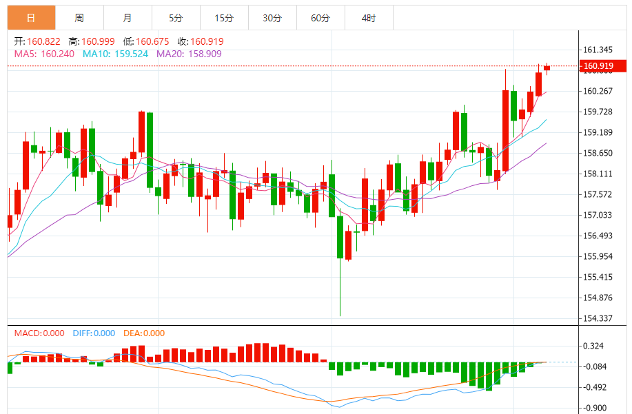 技术上,欧元兑日元昨日在小看涨通道内波动,以保持其看涨轨道,利用160.70支撑线上方的稳定性,今早形成了一些看涨波,收于160.90附近。