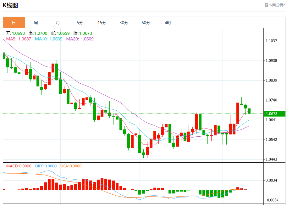 周三盘中,欧元/美元报1.0674,跌幅0.25%。