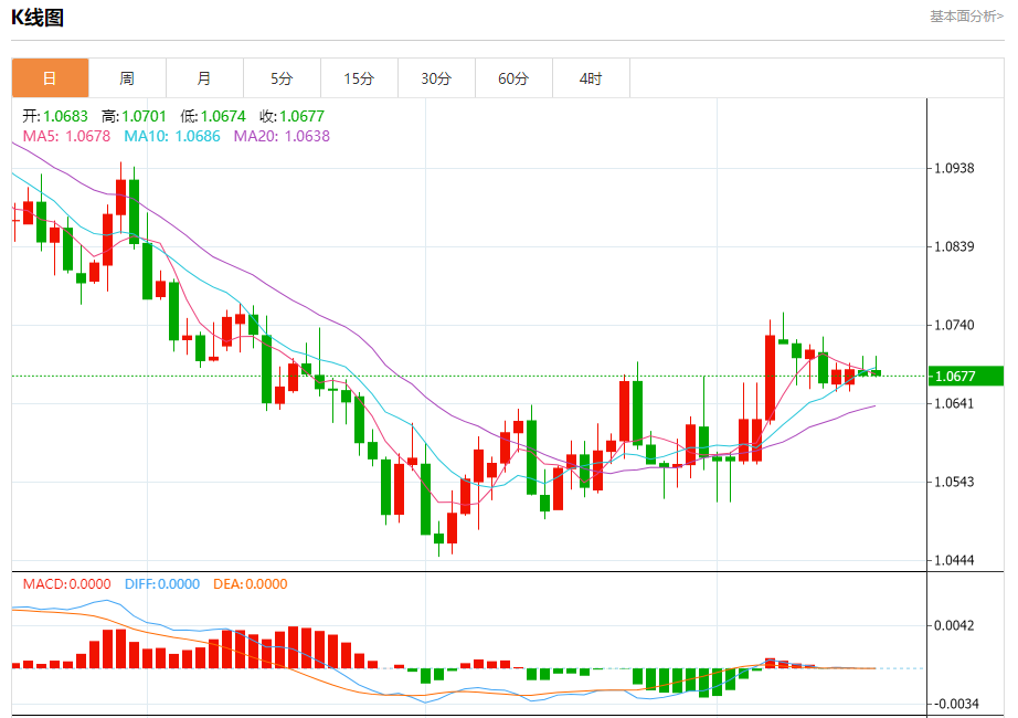 周一盘中,欧元/美元报1.0678,跌幅0.07%。