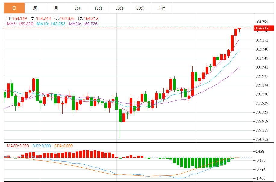 周四,欧元/日元上涨0.04%至164.256附近。