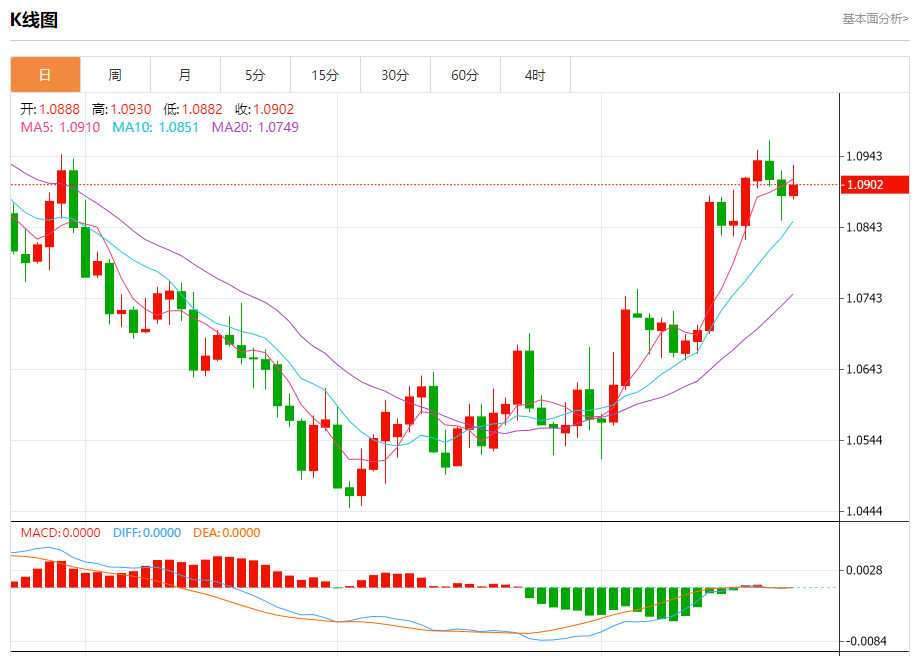 周四盘中,欧元/美元报1.0903,涨幅0.13%。