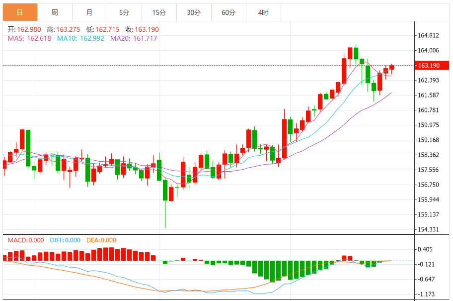周五,欧元/日元上涨0.09%至163.213附近。