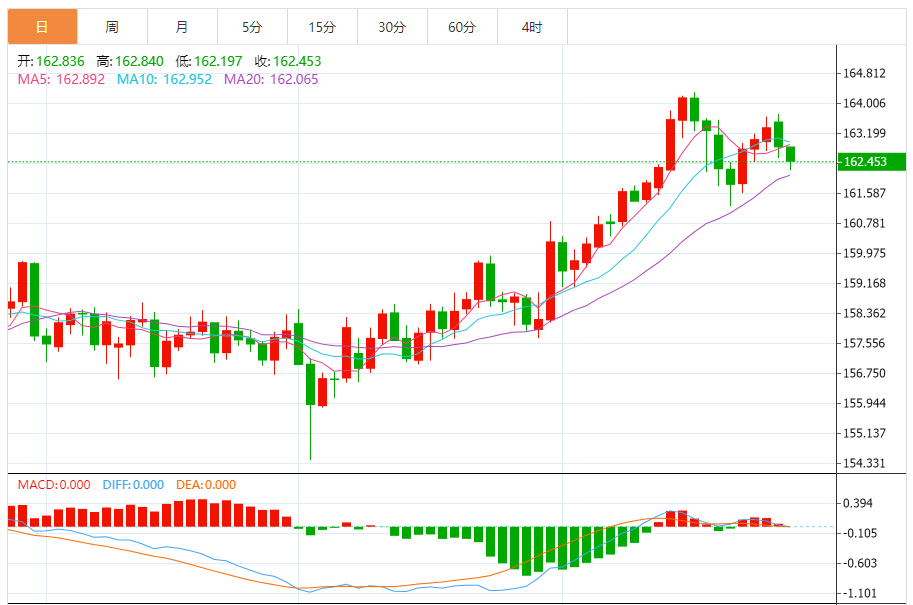 周二,欧元/日元下跌0.24%至162.477附近。