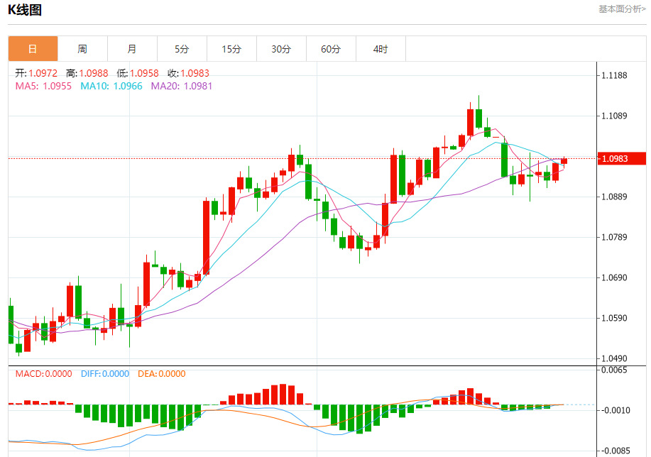 周四盘中,欧元/美元报1.0984,涨幅0.10%。