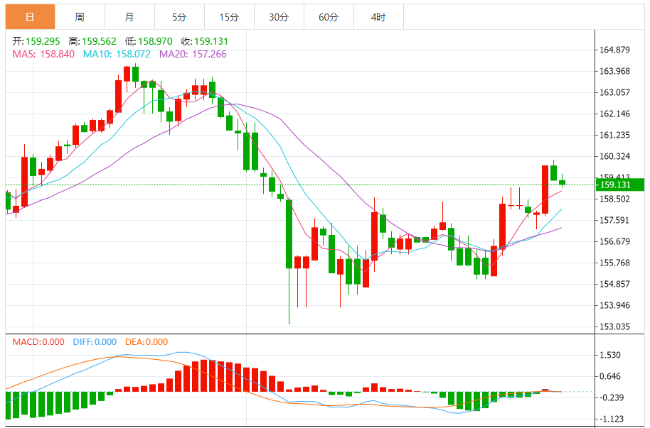 周五,欧元/日元下跌0.11%至159.157附近。