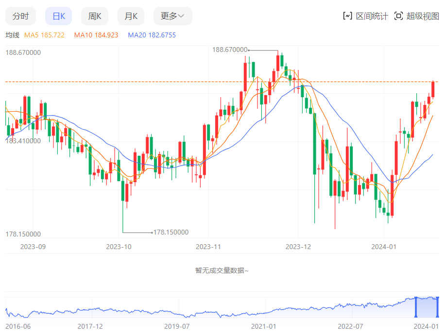 周三,英镑/日元上涨0.44%至186.85附近。
