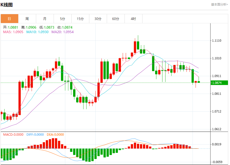 周四盘中,欧元/美元报1.0875,跌幅0.08%。