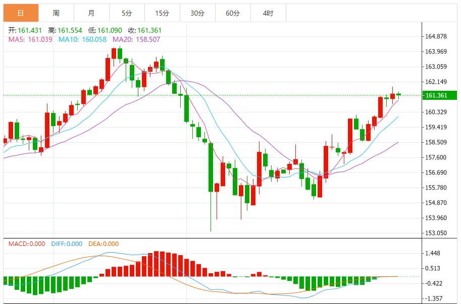 周一,欧元/日元下跌0.04%至161.372附近。