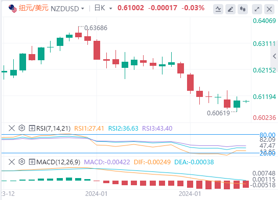 纽元方面,新西兰统计局显示,2023年第四季度新西兰消费者物价指数(CPI)环比增长0.5%,上一季度为1.8%,符合市场预期。按年计算,CPI通胀率同比增长4.7%,而前值为5.6%。受此影响,纽元在0.6100心理关口上方获得牵引力。