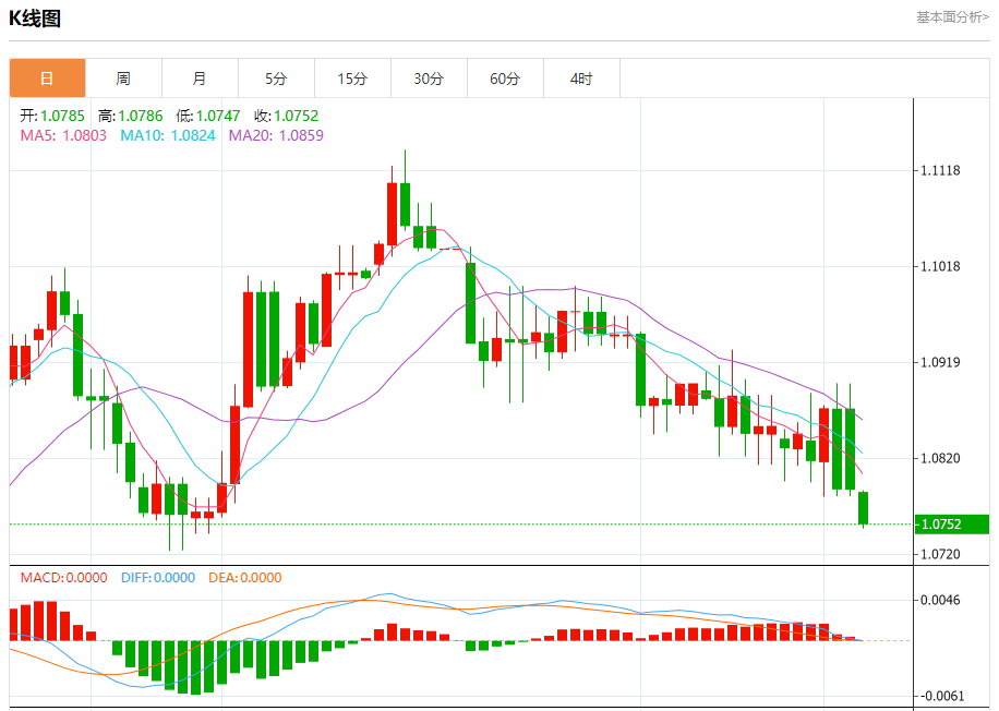 周一盘中,欧元/美元报1.0753,跌幅0.33%。