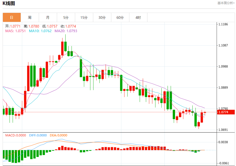 周五盘中,欧元/美元报1.0775,涨幅0.02%。