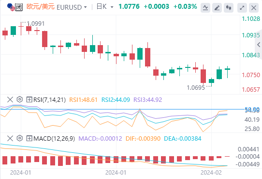 在截至2月16日的一周内,欧元/美元下跌0.08%至1.07743美元。欧元/美元升至周一高点1.08055美元,然后跌至周三低点1.06949美元。