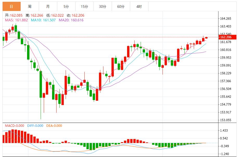 周三,欧元/日元上涨0.06%至162.226附近。