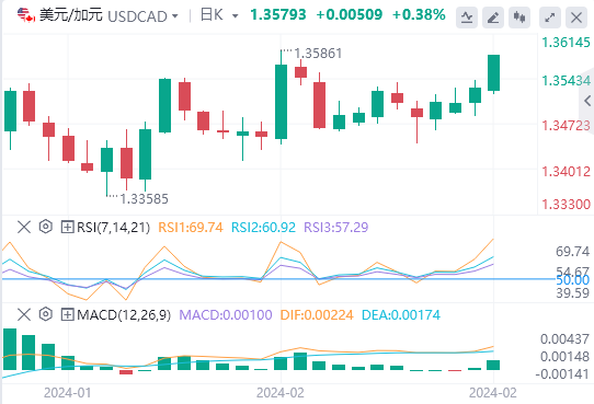 美元走强支撑了美元/加元,这可能是由于在定于周三公布的美国国内生产总值(GDP)年率初值数据公布之前,市场风险厌恶情绪盛行。不过,市场预期美国2023年第四季度国内生产总值增速将保持在3.3%的稳定水平。