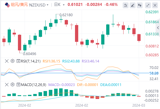 根据移动平均收敛背离(MACD)分析,纽元/美元普遍存在下跌情绪。MACD线位于中线和信号线下方,预示着看跌趋势。此外,14天相对强弱指数(RSI)低于50水平,进一步确认了看跌情绪。