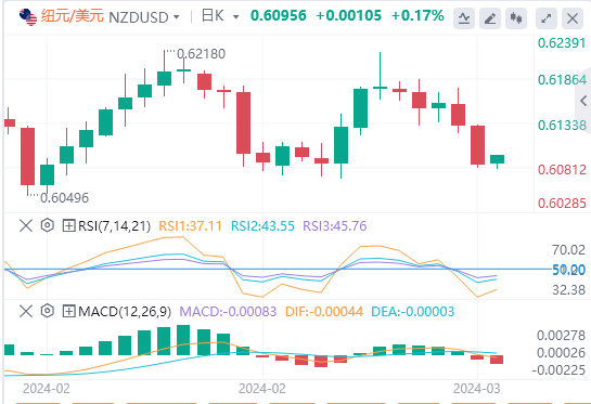 3月18日,周一亚市早盘,纽元/美元在非常关键的200日简单移动均线(SMA)附近获得一些支撑,并从一周半低点(周一亚洲时段触及的0.6080附近)小幅回升。中国宏观数据公布后,纽元/美元维持温和看涨倾向,但缺乏看涨动能,仍遇阻0.6100整数关口。