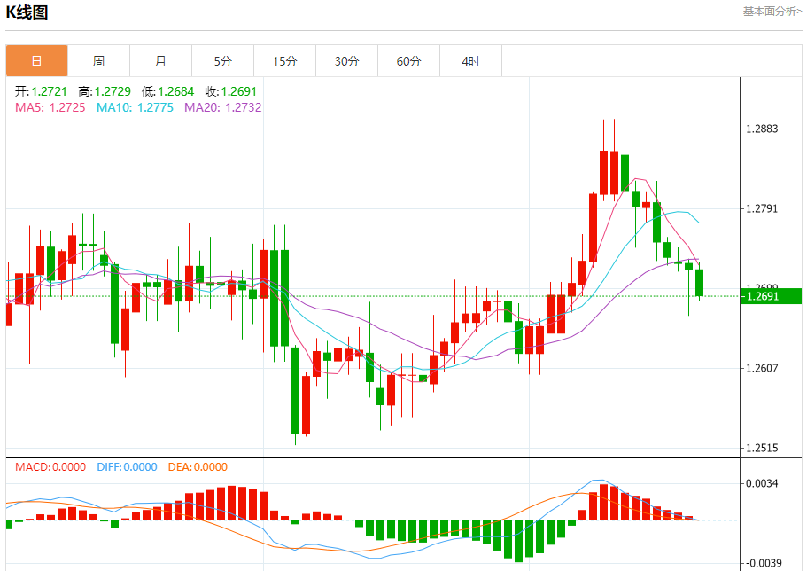 周三盘中,英镑/美元报1.2692,跌幅0.24%。