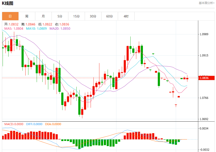 周五盘中,欧元/美元报1.0836,跌幅0.02%。