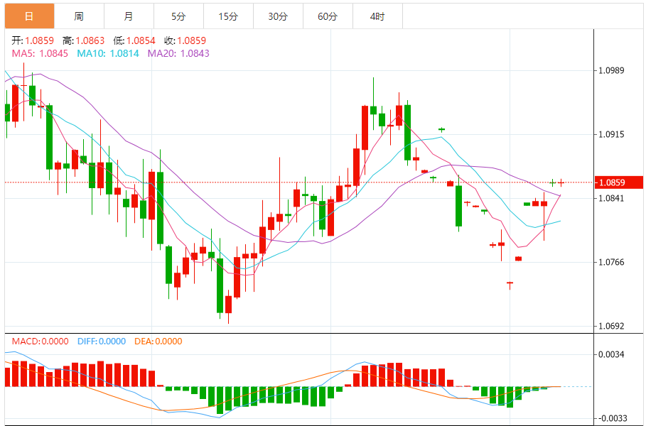 周二,欧元/美元徘徊于1.0860关口下方,现交投于1.0859附近,涨幅0.00%。