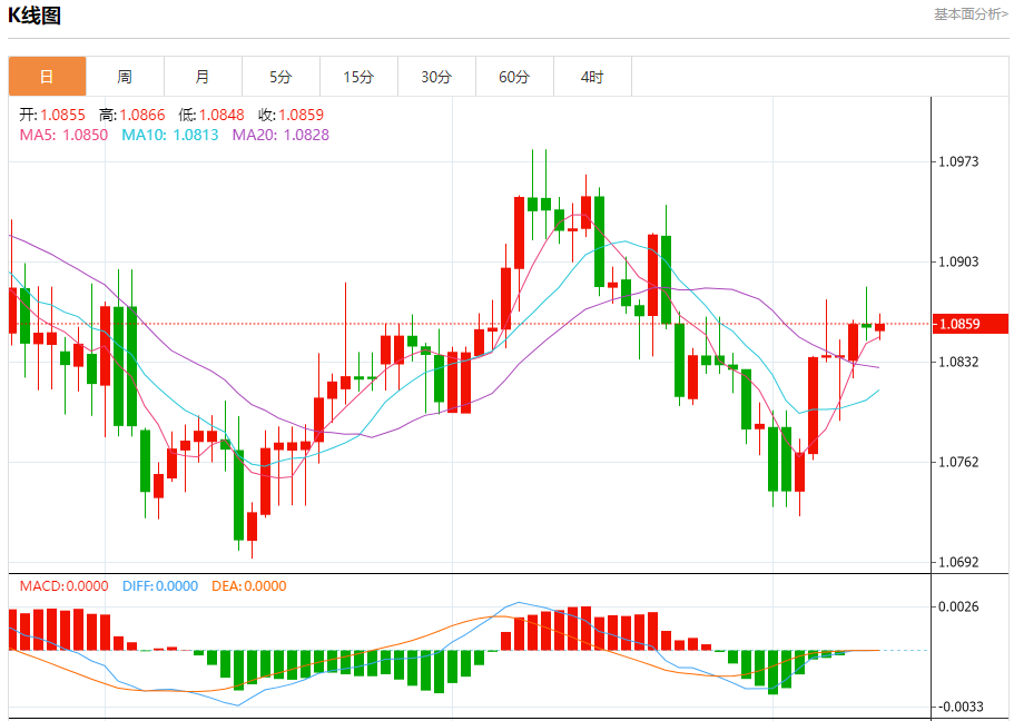 周三盘中,欧元/美元报1.0860,涨幅0.02%。