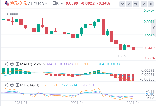 澳元/美元面临挑战,周五澳大利亚证券交易所200指数(ASX200Index)下跌,逼近两个月低点7,489点。这一趋势受到了隔夜华尔街疲软走势的影响。此外,澳大利亚10年期国债收益率跌破4.3%,从四个多月高点回落,原因是投资者预期澳大利亚储备银行(RBA)将对货币政策持鸽派态度。