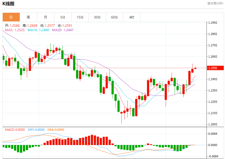 周一盘中,英镑/美元报1.2593,涨幅0.06%。