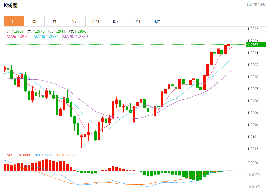 周四盘中,英镑/美元报1.2954,跌幅0.03%。