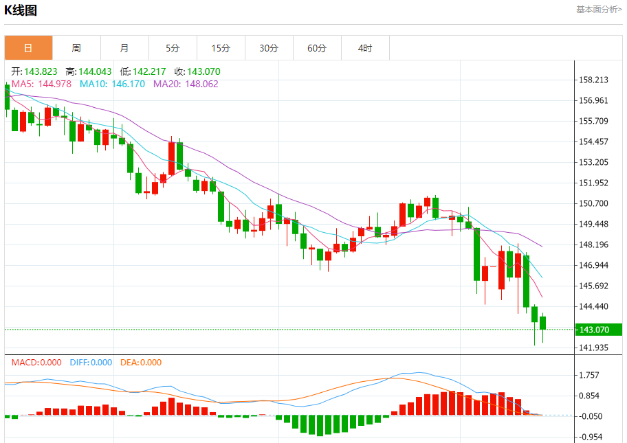 周一盘中,美元/日元报143.174,跌幅0.24%。